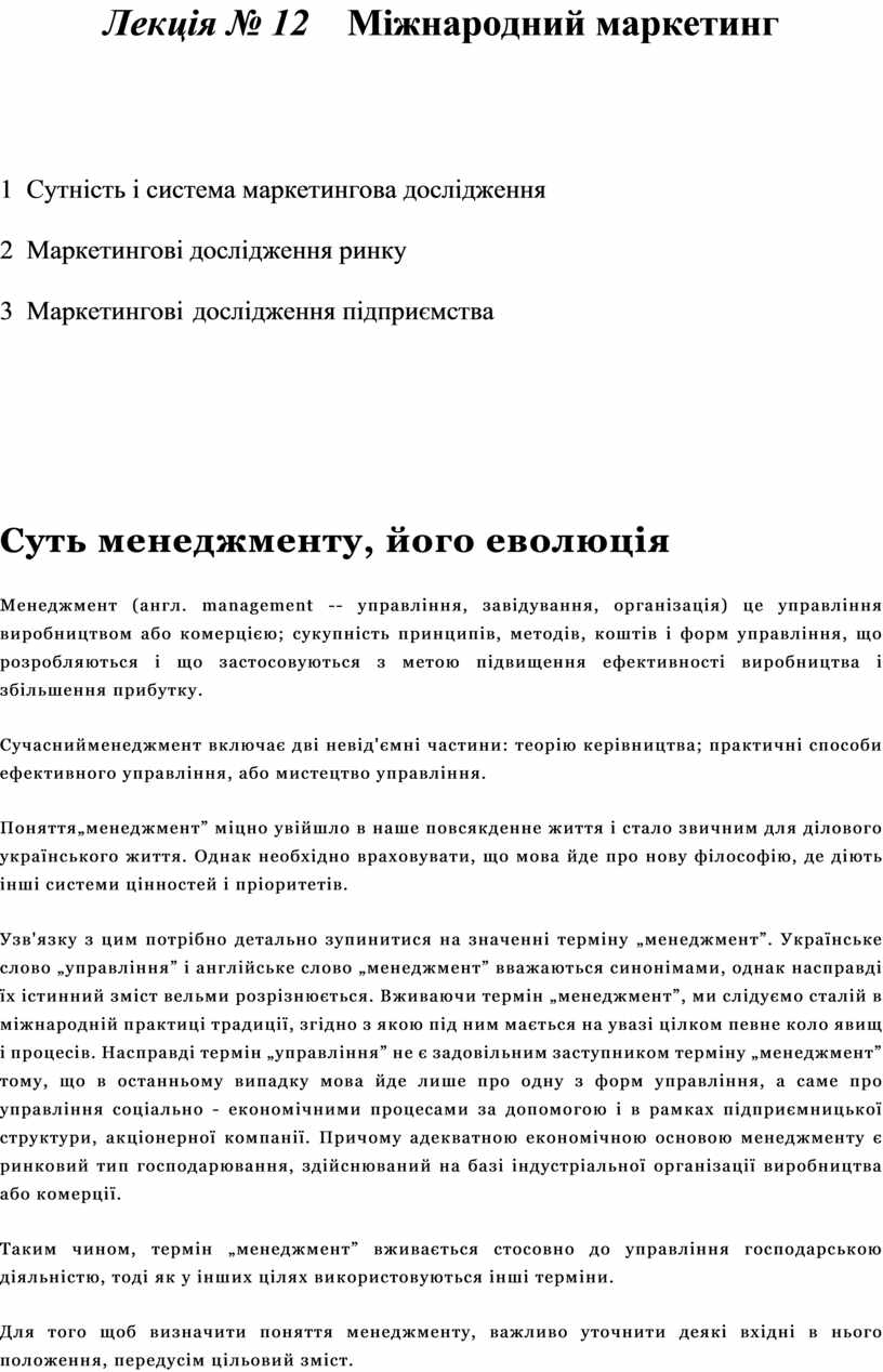Міжнародний менеджмент як наука і господарська практика являє собою продукт розвитку традиційного маркетингу. І якщо останній (традиційний маркетинг) пов'язаний з діяльністю фірми в межах держави, тобто усередині країни, то міжнародний маркетинг орієнтований на пошук шляхів найбільш повної реалізації потенціалу фірми завдяки визначенню місця й умов його використання за межами країни.