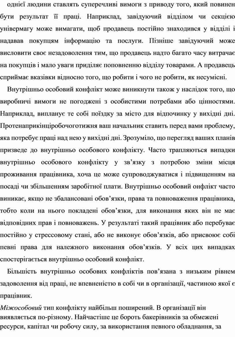Внутрішньоособовий тип конфлікту дещо не відповідає визначенню, яке було зроблено нами раніше. Однак його потенційні дисфункціональні наслідки аналогічні наслідкам інших типів конфліктів. Він може виявитися в різних формах. Одна з найпоширеніших форм – рольовий конфлікт, коли до однієї людини ставлять суперечливі вимоги з приводу того, який повинен бути результат її праці. Наприклад, завідуючий відділом чи секцією універмагу може вимагати, щоб продавець постійно знаходився у відділі і надавав покупцям інформацію та послуги. Пізніше завідуючий може висловити своє незадоволення тим, що продавець надто багато часу витрачає на покупців і мало уваги приділяє поповненню відділу товарами. А продавець сприймає вказівки відносно того, що робити і чого не робити, як несумісні.