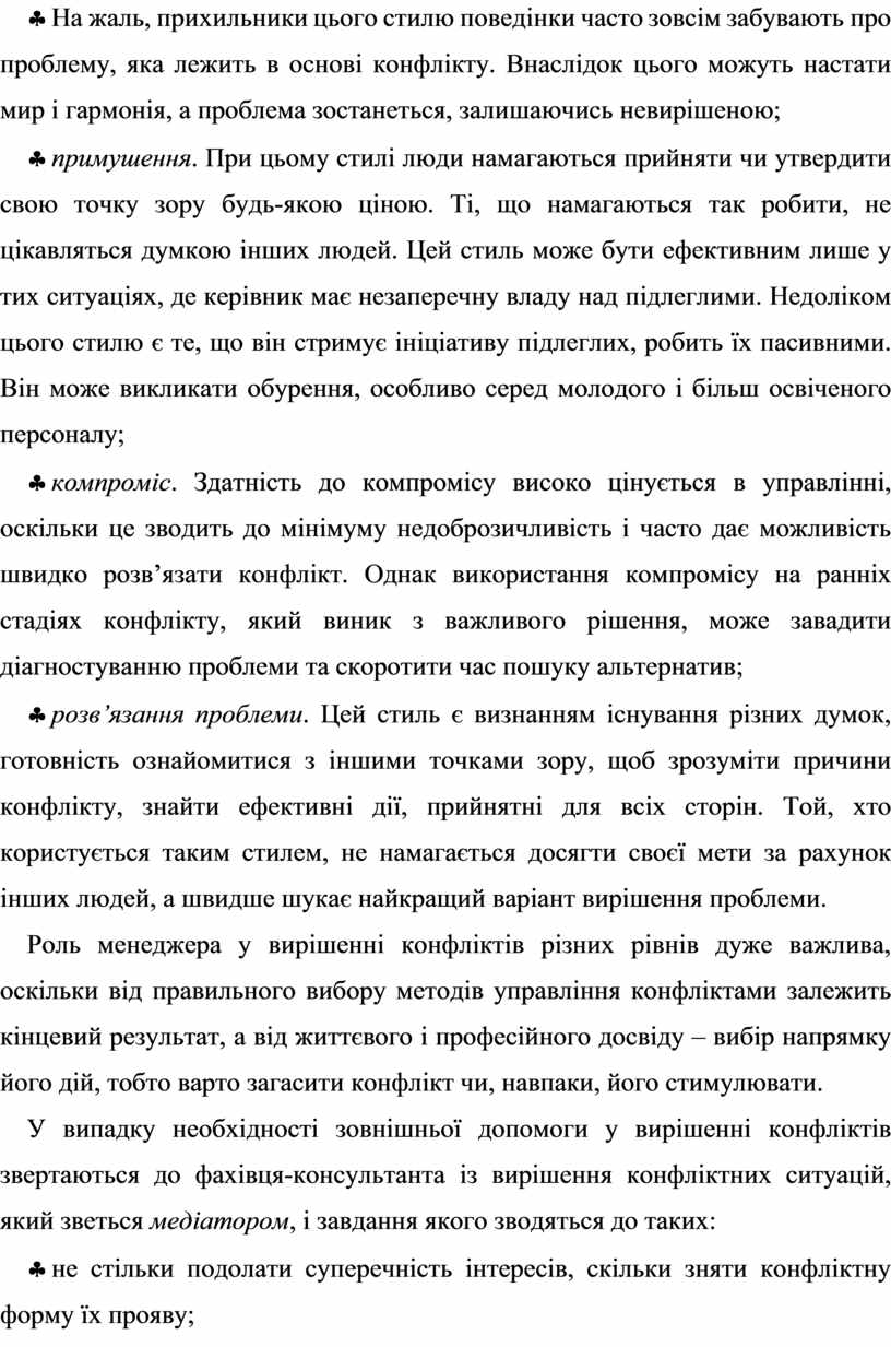 Роль менеджера у вирішенні конфліктів різних рівнів дуже важлива, оскільки від правильного вибору методів управління конфліктами залежить кінцевий результат, а від життєвого і професійного досвіду – вибір напрямку його дій, тобто варто загасити конфлікт чи, навпаки, його стимулювати.