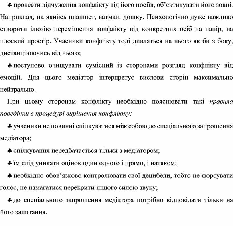 § поступово очищувати сумісний із сторонами розгляд конфлікту від емоцій. Для цього медіатор інтерпретує вислови сторін максимально нейтрально.