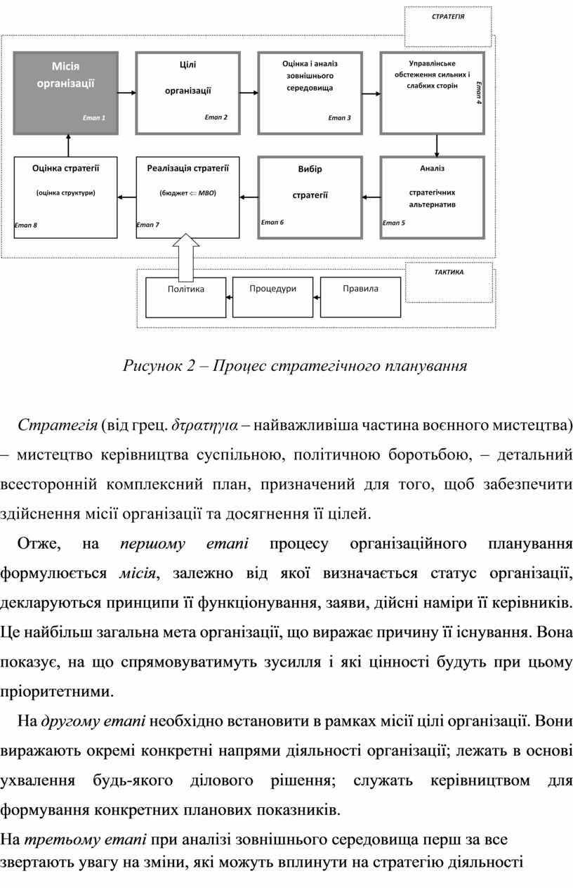 Порівнюючи стратегічне і тактичне планування, слід зазначити, що останнє є пошуком і узгодженням найбільш ефективних шляхів і засобів реалізації прийнятої стратегії розвитку організації (рис. 2). Відповідно в процесі тактичного планування розробляються оперативні плани, на основі яких здійснюються конкретні заходи з реалізації стратегії в конкретній ситуації.