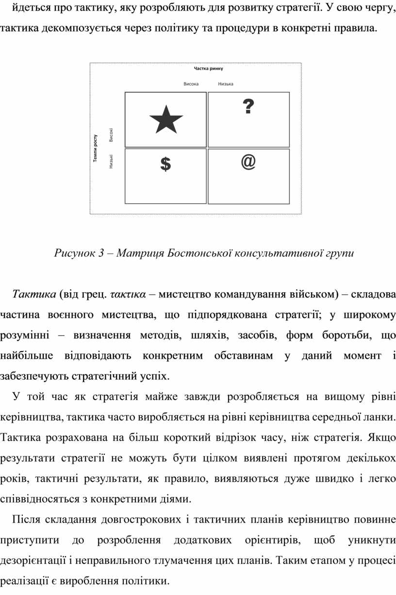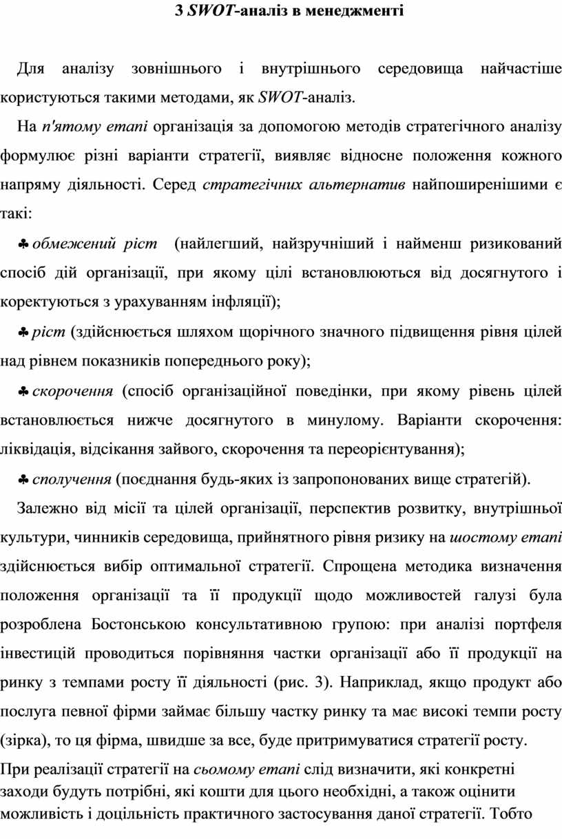 Залежно від місії та цілей організації, перспектив розвитку, внутрішньої культури, чинників середовища, прийнятного рівня ризику на шостому етапі здійснюється вибір оптимальної стратегії. Спрощена методика визначення положення організації та її продукції щодо можливостей галузі була розроблена Бостонською консультативною групою: при аналізі портфеля інвестицій проводиться порівняння частки організації або її продукції на ринку з темпами росту її діяльності (рис. 3). Наприклад, якщо продукт або послуга певної фірми займає більшу частку ринку та має високі темпи росту (зірка), то ця фірма, швидше за все, буде притримуватися стратегії росту.