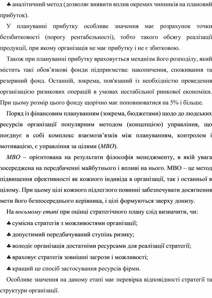 МВО – орієнтована на результати філософія менеджменту, в якій увага зосереджена на передбаченні майбутнього і впливі на нього. МВО – це метод підвищення ефективності як кожного індивіда в організації, так і останньої в цілому. При цьому цілі кожного підлеглого повинні забезпечувати досягнення мети його безпосереднього керівника, і цілі формуються зверху донизу.