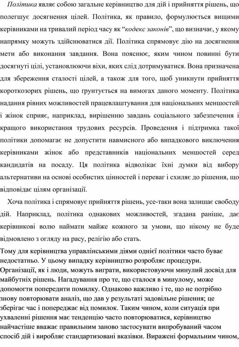 Політика являє собою загальне керівництво для дій і прийняття рішень, що полегшує досягнення цілей. Політика, як правило, формулюється вищими керівниками на тривалий період часу як “кодекс законів”, що визначає, у якому напрямку можуть здійснюватися дії. Політика спрямовує дію на досягнення мети або виконання завдання. Вона пояснює, яким чином повинні бути досягнуті цілі, установлюючи віхи, яких слід дотримуватися. Вона призначена для збереження сталості цілей, а також для того, щоб уникнути прийняття короткозорих рішень, що ґрунтується на вимогах даного моменту. Політика надання рівних можливостей працевлаштування для національних меншостей і жінок сприяє, наприклад, вирішенню завдань соціального забезпечення і кращого використання трудових ресурсів. Проведення і підтримка такої політики допомагає не допустити навмисного або випадкового виключення керівниками жінок або представників національних меншостей серед кандидатів на посаду. Ця політика відволікає їхні думки від вибору альтернативи на основі особистих цінностей і переваг і схиляє до рішення, що відповідає цілям організації.