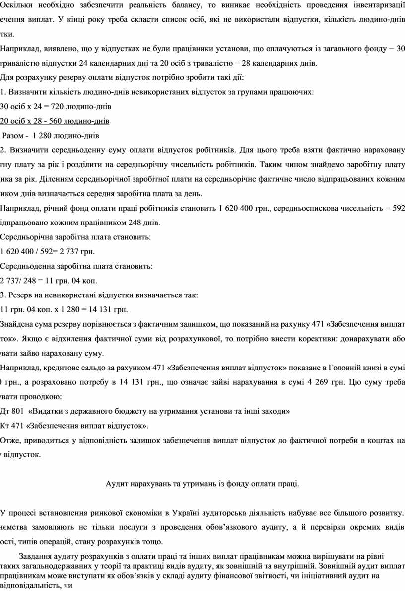Оскільки необхідно забезпечити реальність балансу, то виникає необхідність проведення інвентаризації забезпечення виплат. У кінці року треба скласти список осіб, які не використали відпустки, кількість людино-днів відпустки.