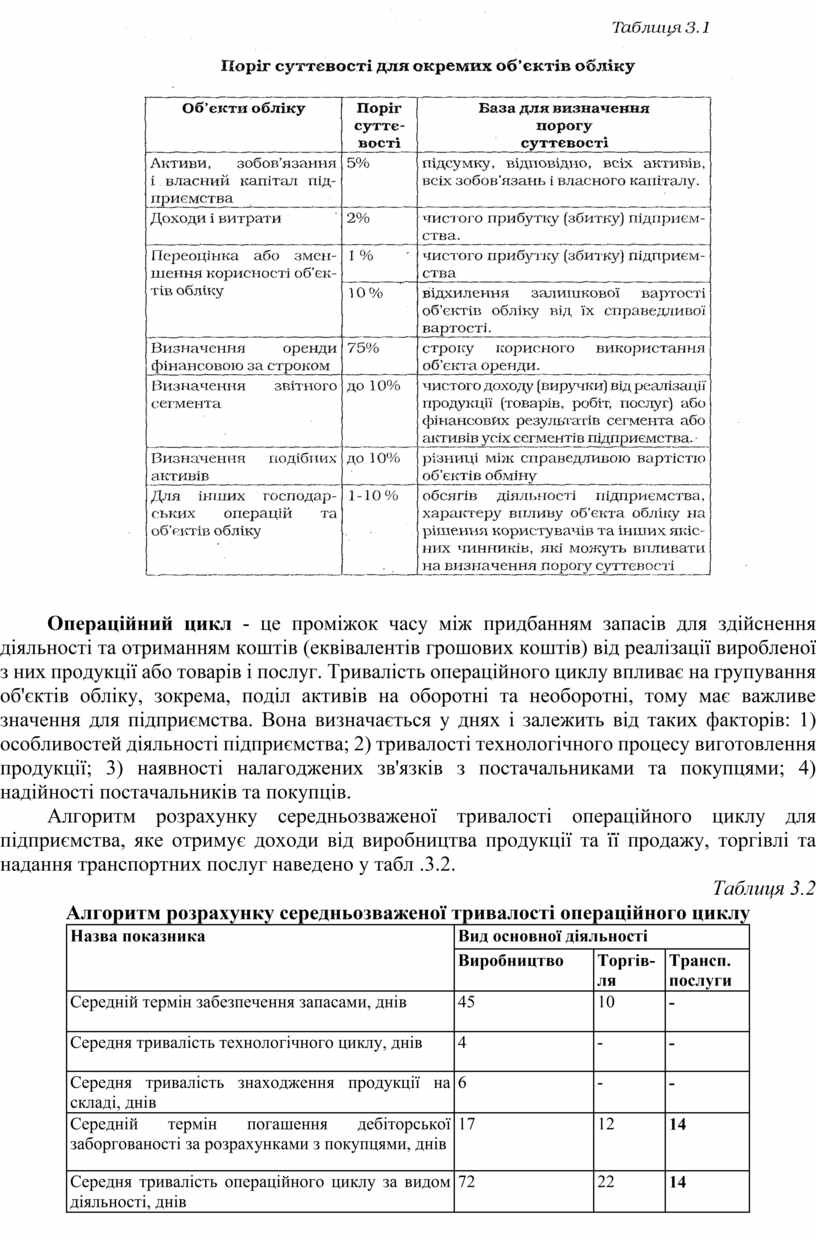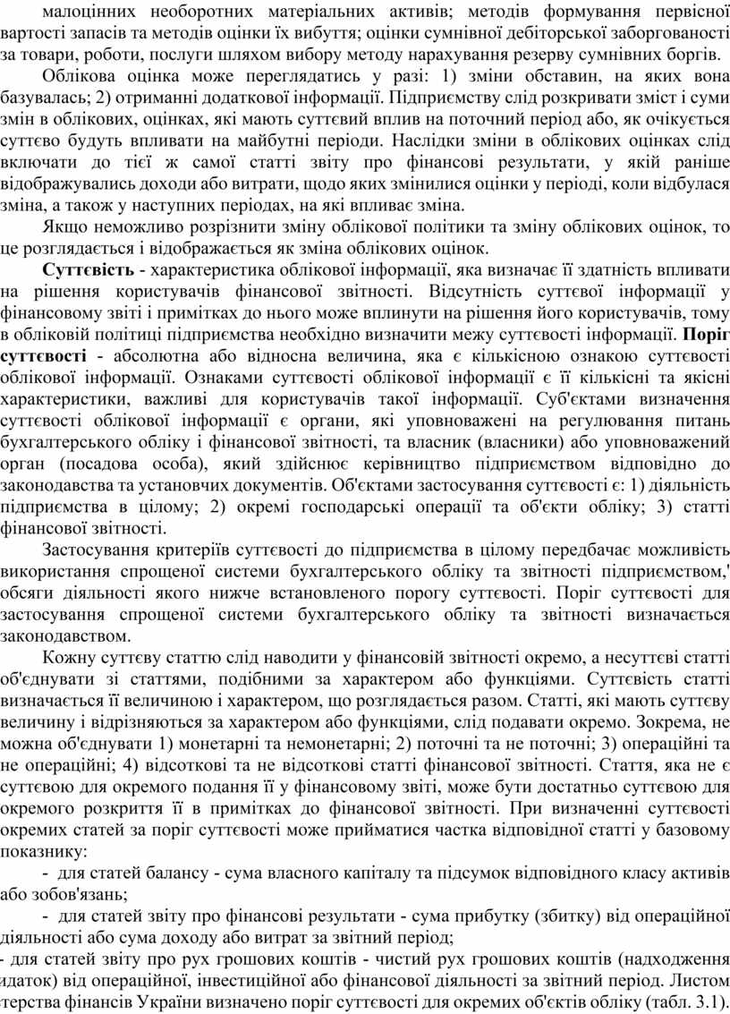 - для статей звіту про рух грошових коштів - чистий рух грошових коштів (надходження або видаток) від операційної, інвестиційної або фінансової діяльності за звітний період. Листом Міністерства фінансів України визначено поріг суттєвості для окремих об'єктів обліку (табл. 3.1).