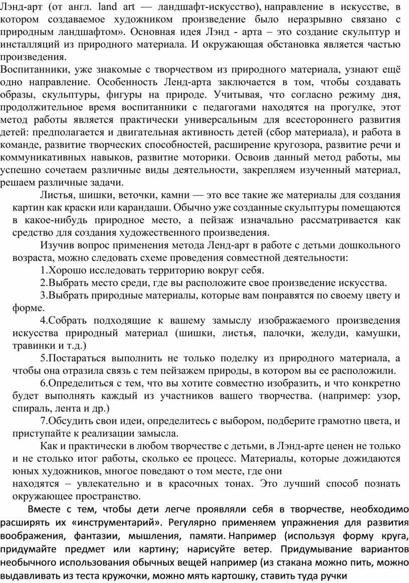 Воспитанники, уже знакомые с творчеством из природного материала, узнают ещё одно направление. Особенность Ленд-арта заключается в том, чтобы создавать образы, скульптуры, фигуры на природе. Учитывая, что согласно режиму дня, продолжительное время воспитанники с педагогами находятся на прогулке, этот метод работы является практически универсальным для всестороннего развития детей: предполагается и двигательная активность детей (сбор материала), и работа в команде, развитие творческих способностей, расширение кругозора, развитие речи и коммуникативных навыков, развитие моторики. Освоив данный метод работы, мы успешно сочетаем различные виды деятельности, закрепляем изученный материал, решаем различные задачи.