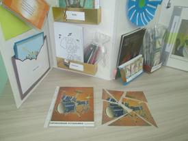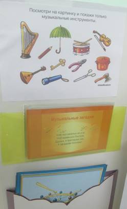 6. «Пазлы» (верхний кармашек) – представлены картинки музыкальных инструментов и их копия разрезных картинок. Ребенок должен собрать пазлы по