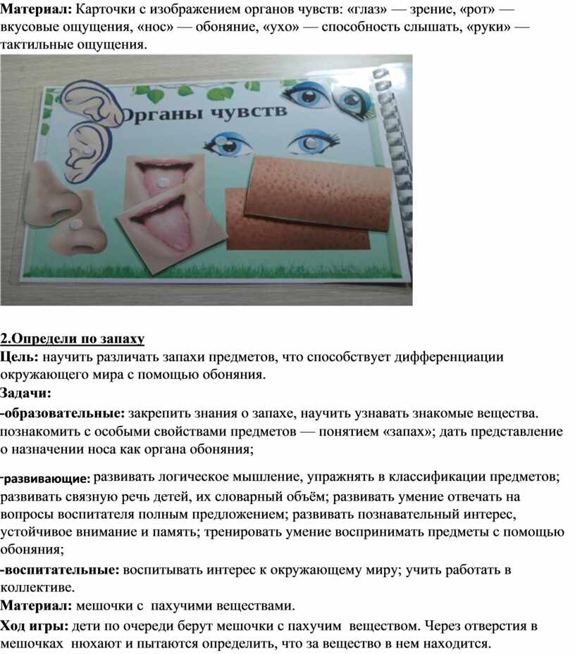Цель: закрепить знания детей об органах чувств (слух, зрение, вкус, обоняние, осязание) и их значении для человека; сформировать представление о роли органов чувств в познании окружающего мира.