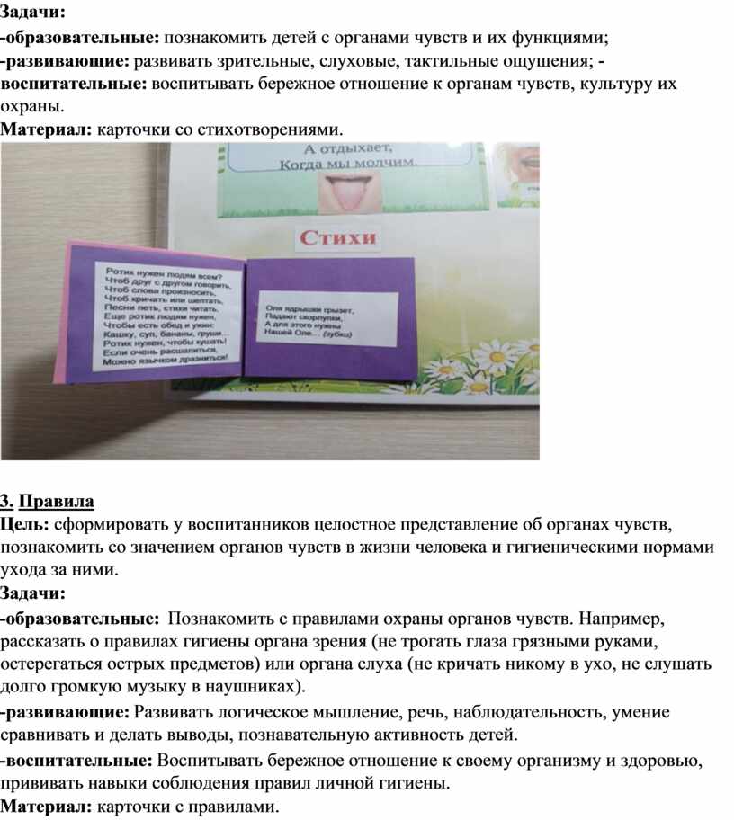 Цель: сформировать у воспитанников целостное представление об органах чувств, познакомить со значением органов чувств в жизни человека и гигиеническими нормами ухода за ними.