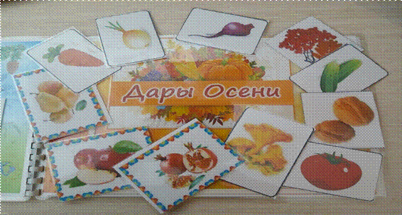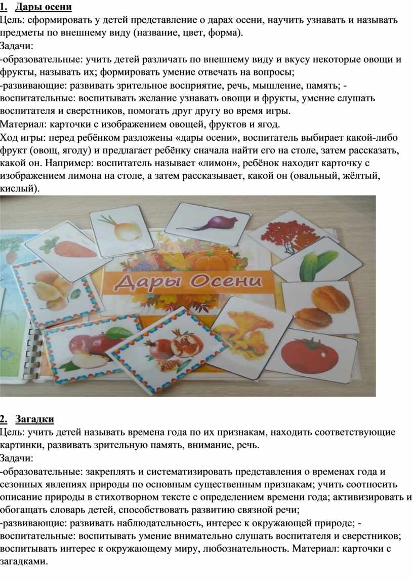 Ход игры: перед ребёнком разложены «дары осени», воспитатель выбирает какой-либо фрукт (овощ, ягоду) и предлагает ребёнку сначала найти его на столе, затем рассказать, какой он. Например: воспитатель называет «лимон», ребёнок находит карточку с изображением лимона на столе, а затем рассказывает, какой он (овальный, жёлтый, кислый).