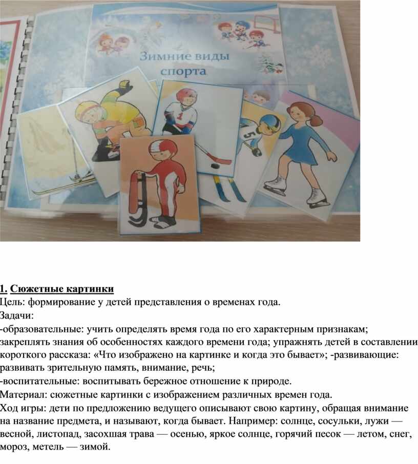 Ход игры: воспитатель описывает время года, а дети его отгадывают. Например: «В это время года дети любят кататься на санках, лепить снеговика» — дети отвечают и поднимают картинку, на которой изображена зима.