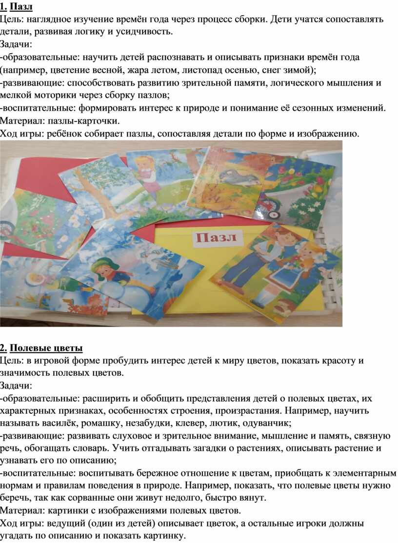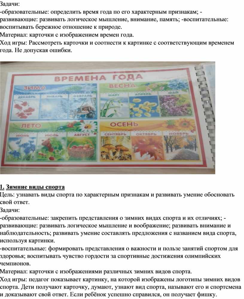 -образовательные: учить определять время года по его характерным признакам; закреплять знания об особенностях каждого времени года; упражнять детей в составлении короткого рассказа: «Что изображено на картинке и когда это бывает»; -развивающие: развивать зрительную память, внимание, речь;