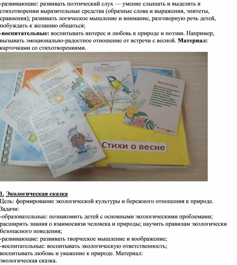 -воспитательные: воспитывать интерес и любовь к природе и поэзии. Например, вызывать эмоционально-радостное отношение от встречи с весной. Материал: карточками со стихотворениями.