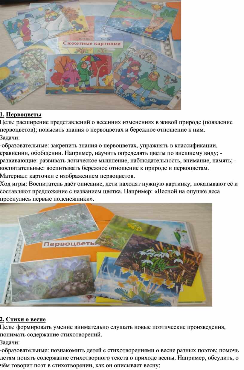 Цель: расширение представлений о весенних изменениях в живой природе (появление первоцветов); повысить знания о первоцветах и бережное отношение к ним.