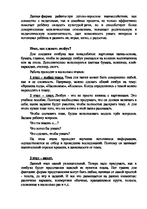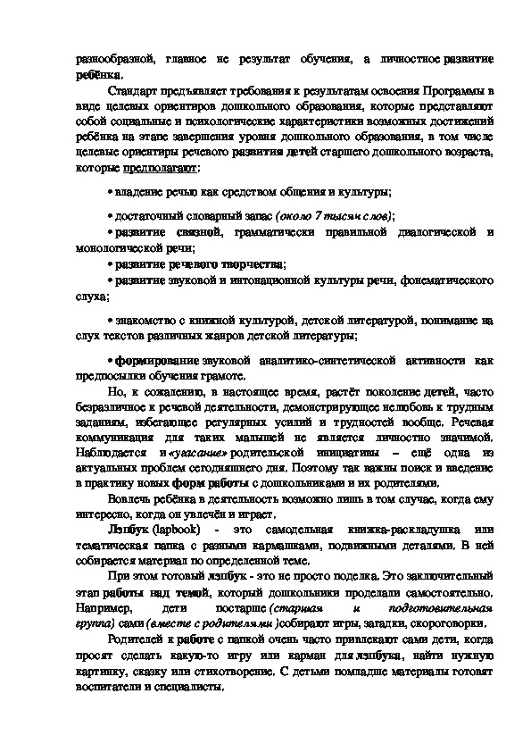 Как сделать так, чтобы информация осталась в памяти ребенка, чтобы он мог научиться пользоваться теми знаниями, которые получил в детском саду, чтобы он захотел самостоятельно расширить свои знания по данному вопросу. Одним из способов достижения этой цели образования на данном этапе развития общества является использовании методики создания лэпбука. Данный материал содержит : целевые ориентиры речевого развития детей старшего дошкольного возраста в условиях реализации федерального государственного образовательного стандарта дошкольного образования; Результаты и выводы, к которым пришли дети, педагоги и родители, проработав с лэпбуками; описание основных этапов изготовления лепбукаКонсультация для педагогов и родителей