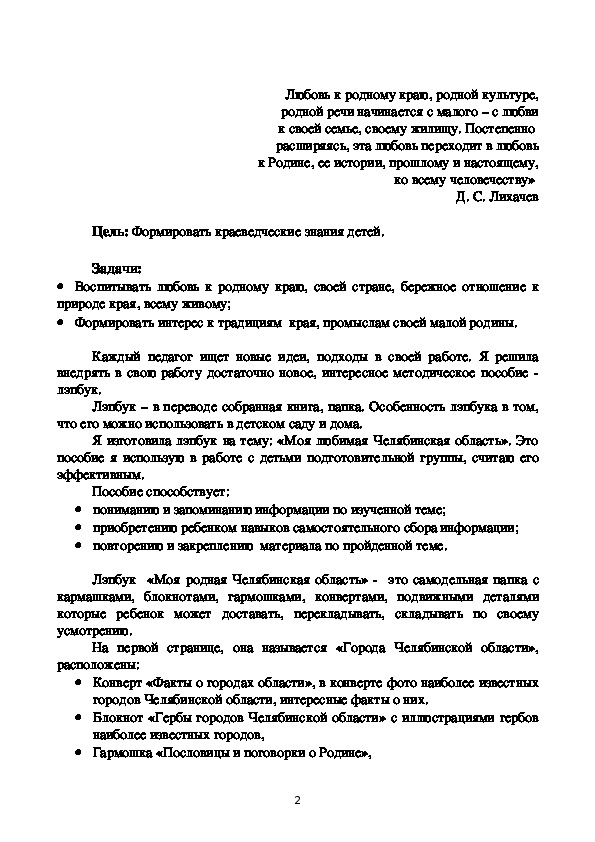 Я изготовила лэпбук на тему: «Моя любимая Челябинская область». Это пособие я использую в работе с детьми подготовительной группы, считаю его эффективным.