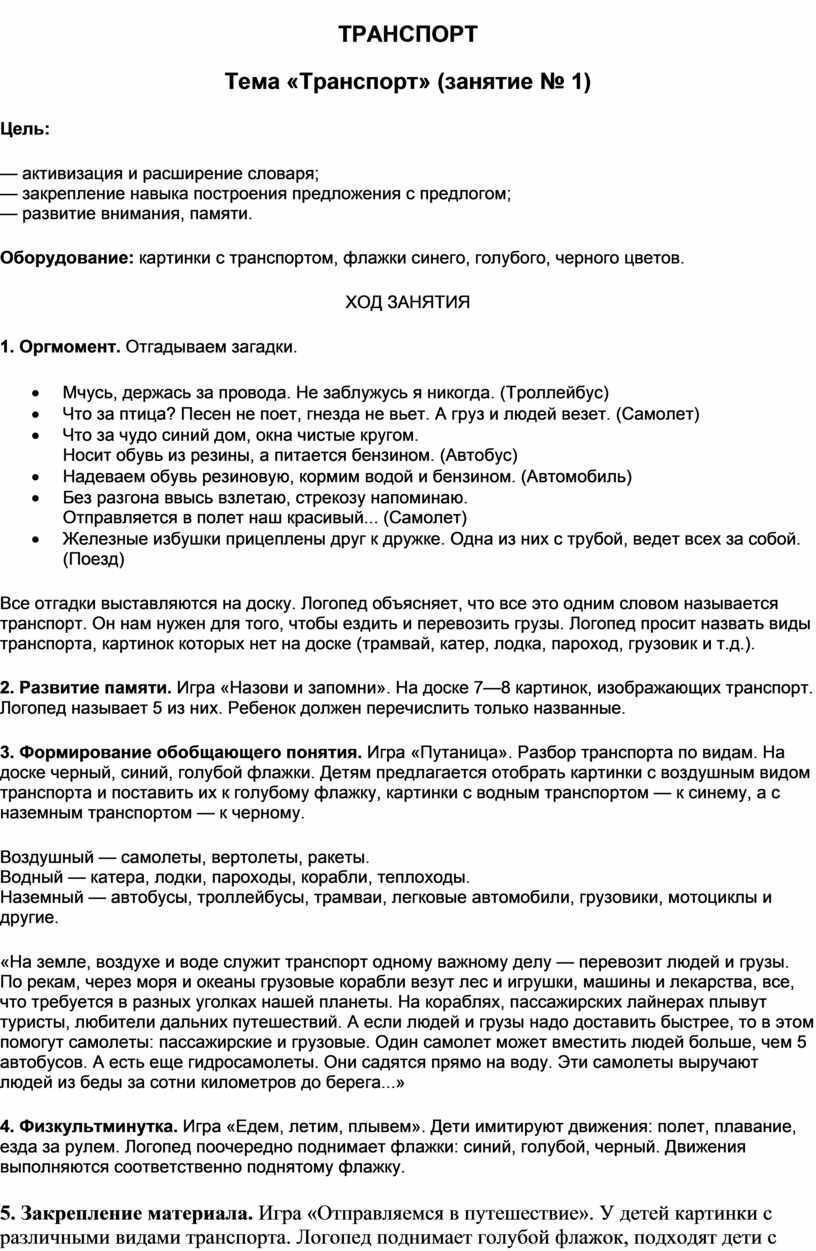1. Оргмомент. Игра «Волейбол». Дети стоят по кругу. Логопед ставит задачу: назвать только наземный вид транспорта. Логопед как будто бросает ребенку мяч, если слово действительно обозначает наземный вид транспорта. Ребенок имитирует движение ловли мяча; если нет, делает отталкивающее движение руками.