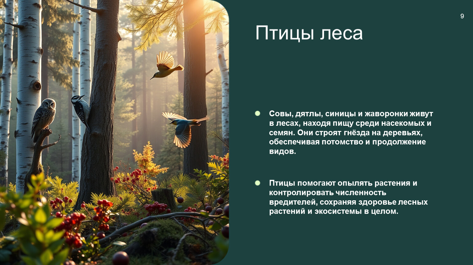 Совы, дятлы, синицы и жаворонки живут в лесах, находя пищу среди насекомых и семян. Они строят гнёзда на деревьях, обеспечивая потомство и продолжение видов.