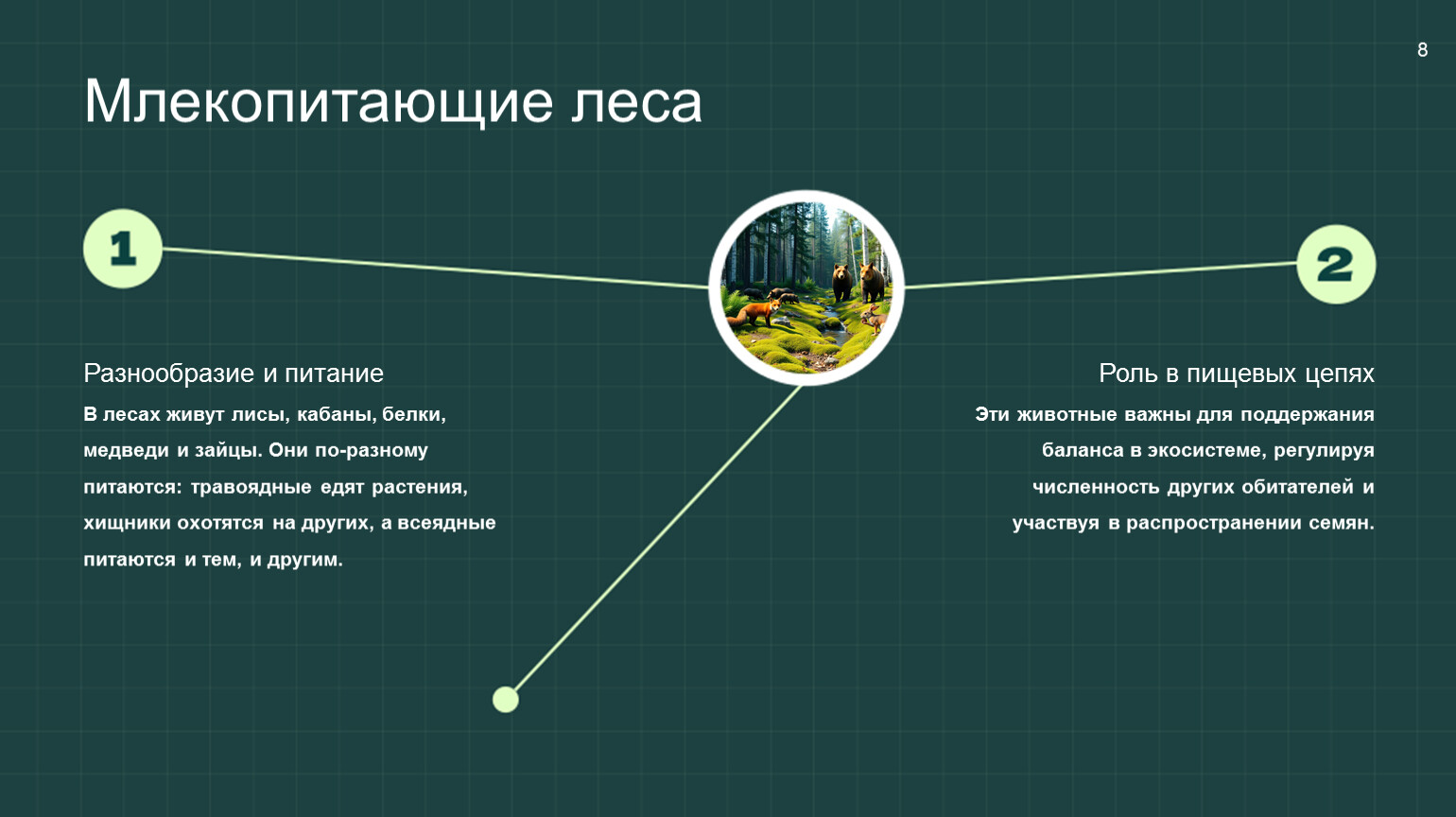 Разнообразие и питание В лесах живут лисы, кабаны, белки, медведи и зайцы. Они по-разному питаются: травоядные едят растения, хищники охотятся на других, а всеядные питаются и тем, и другим.