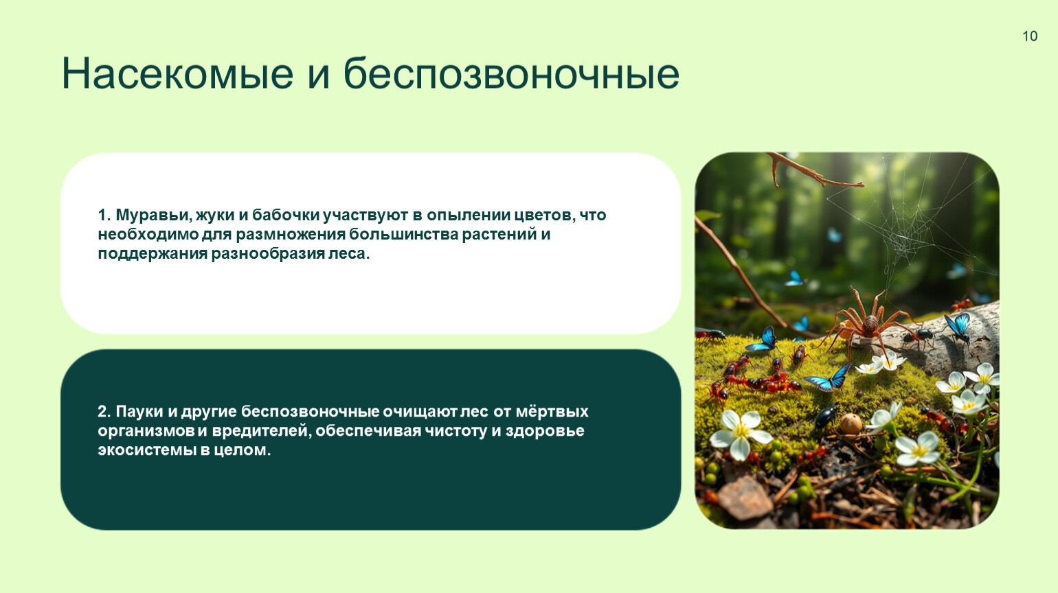 1. Муравьи, жуки и бабочки участвуют в опылении цветов, что необходимо для размножения большинства растений и поддержания разнообразия леса.