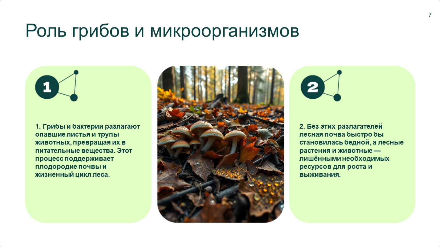 1. Грибы и бактерии разлагают опавшие листья и трупы животных, превращая их в питательные вещества. Этот процесс поддерживает плодородие почвы и жизненный цикл леса.