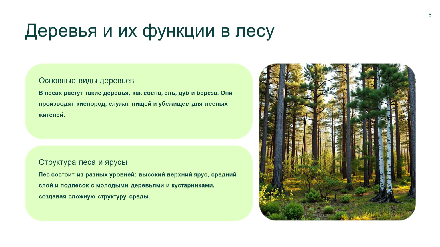 Основные виды деревьев В лесах растут такие деревья, как сосна, ель, дуб и берёза. Они производят кислород, служат пищей и убежищем для лесных жителей.