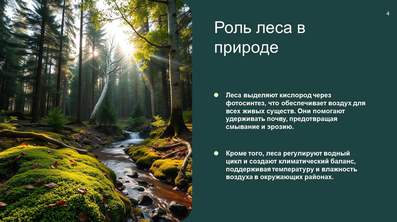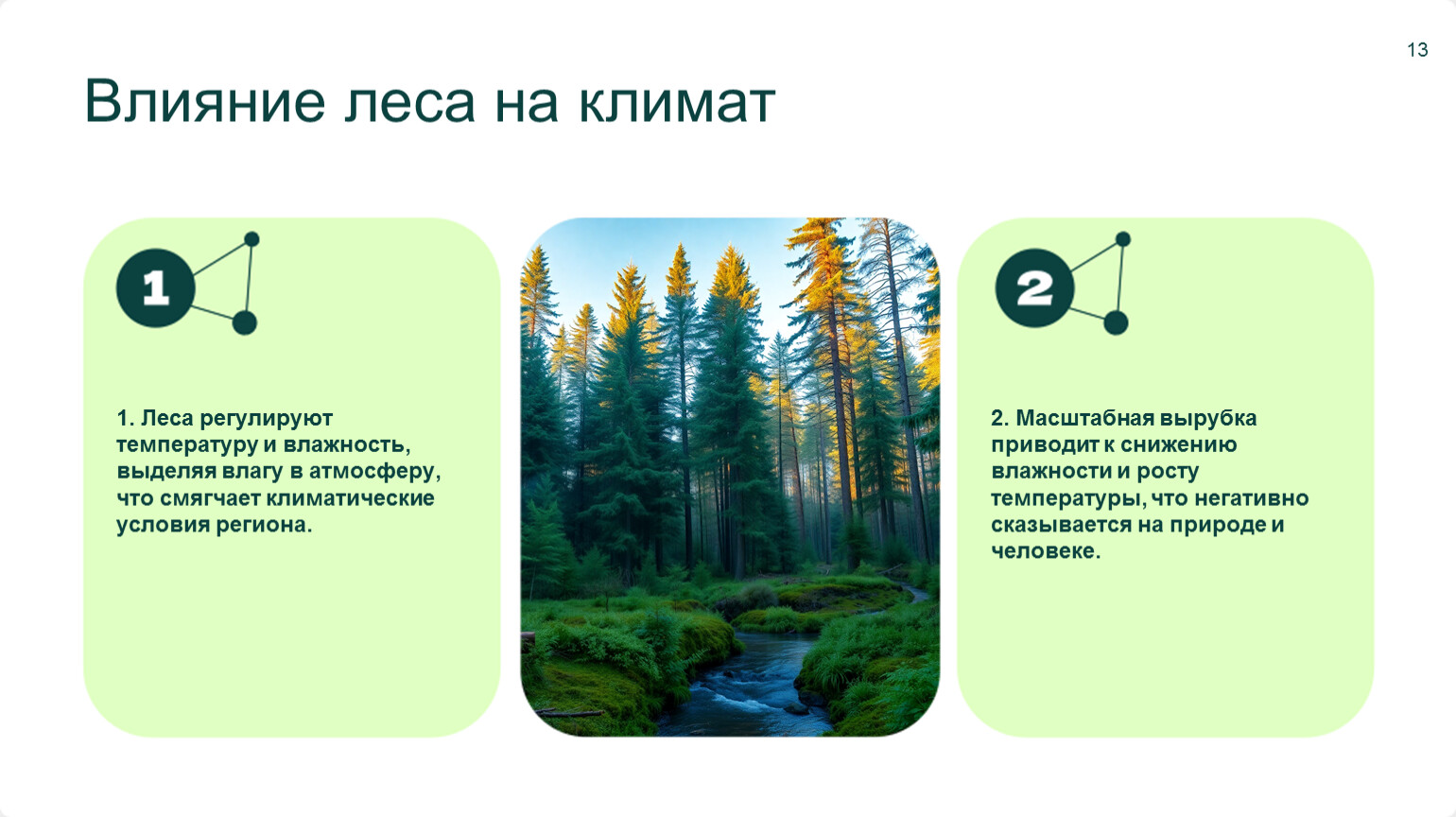 1. Леса регулируют температуру и влажность, выделяя влагу в атмосферу, что смягчает климатические условия региона.