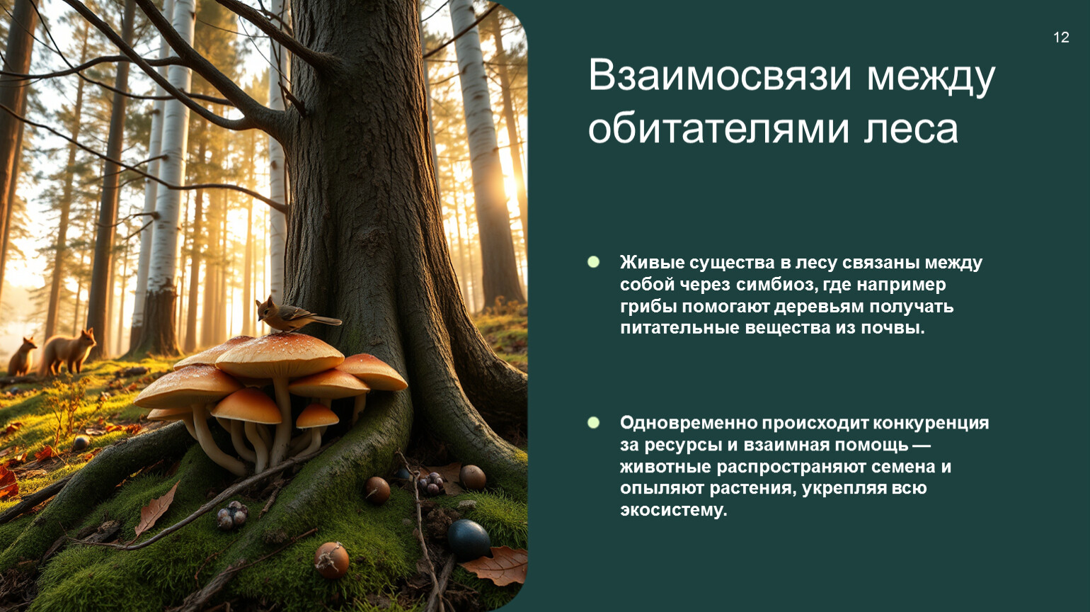 Живые существа в лесу связаны между собой через симбиоз, где например грибы помогают деревьям получать питательные вещества из почвы.