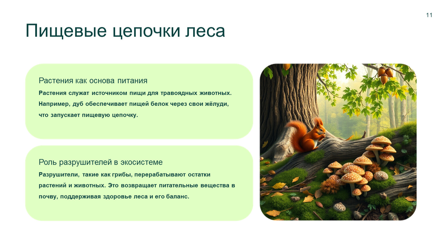 Роль разрушителей в экосистеме Разрушители, такие как грибы, перерабатывают остатки растений и животных. Это возвращает питательные вещества в почву, поддерживая здоровье леса и его баланс.