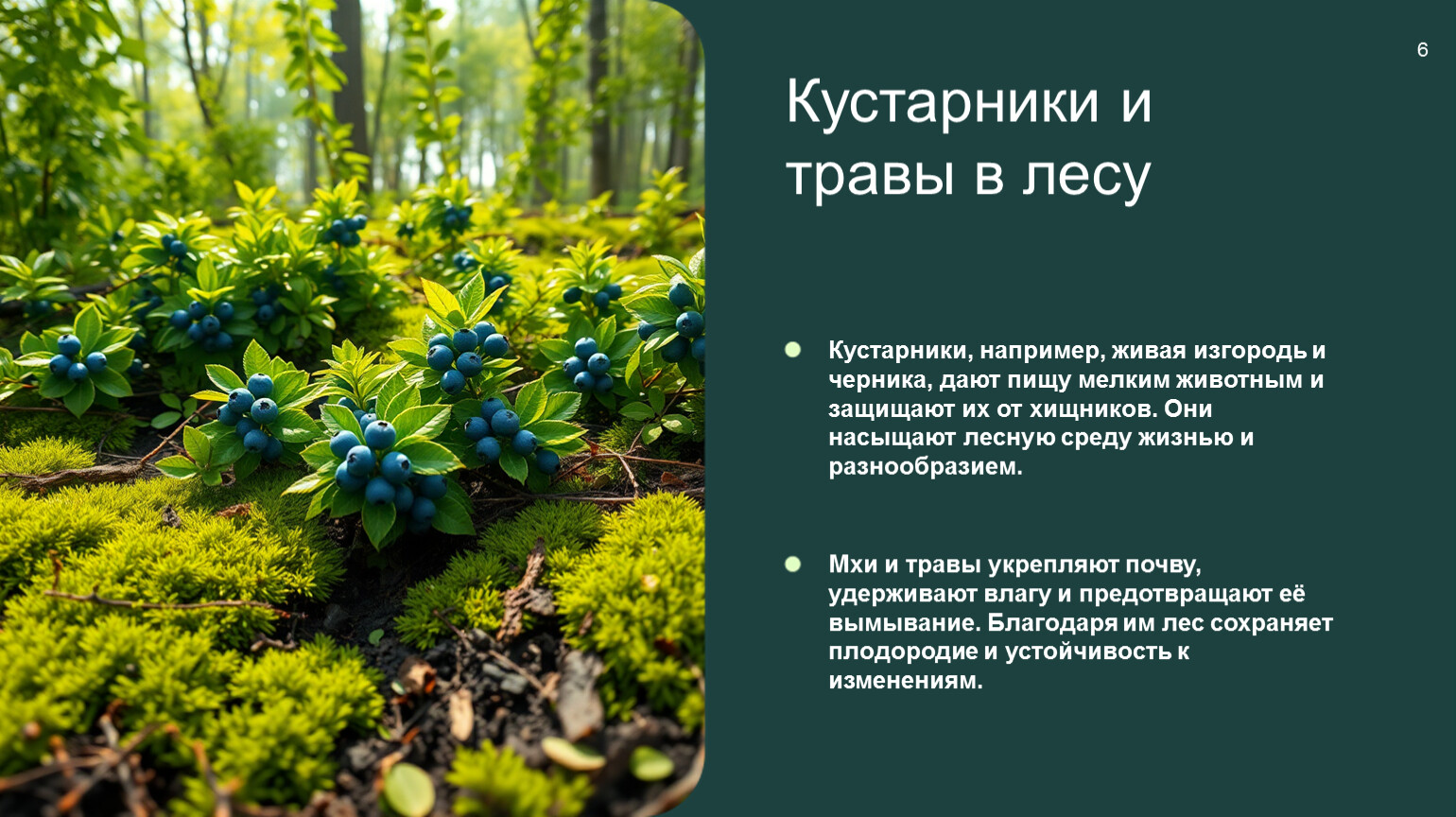 Кустарники, например, живая изгородь и черника, дают пищу мелким животным и защищают их от хищников. Они насыщают лесную среду жизнью и разнообразием.