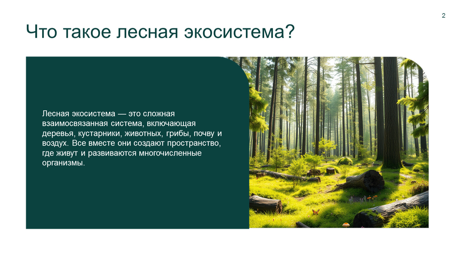 Лесные экосистемы: обзор и ключевые темы Лес — это живой мир с растениями, животными и воздухом, которые вместе создают уникальную природу.
