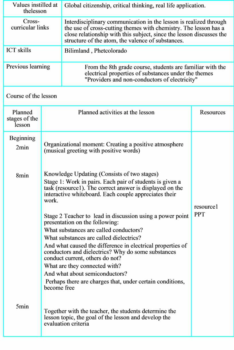 Interdisciplinary communication in the lesson is realized through the use of cross-cutting themes with chemistry. The lesson has a close relationship with this subject, since the lesson discusses the structure of the atom, the valence of substances. |