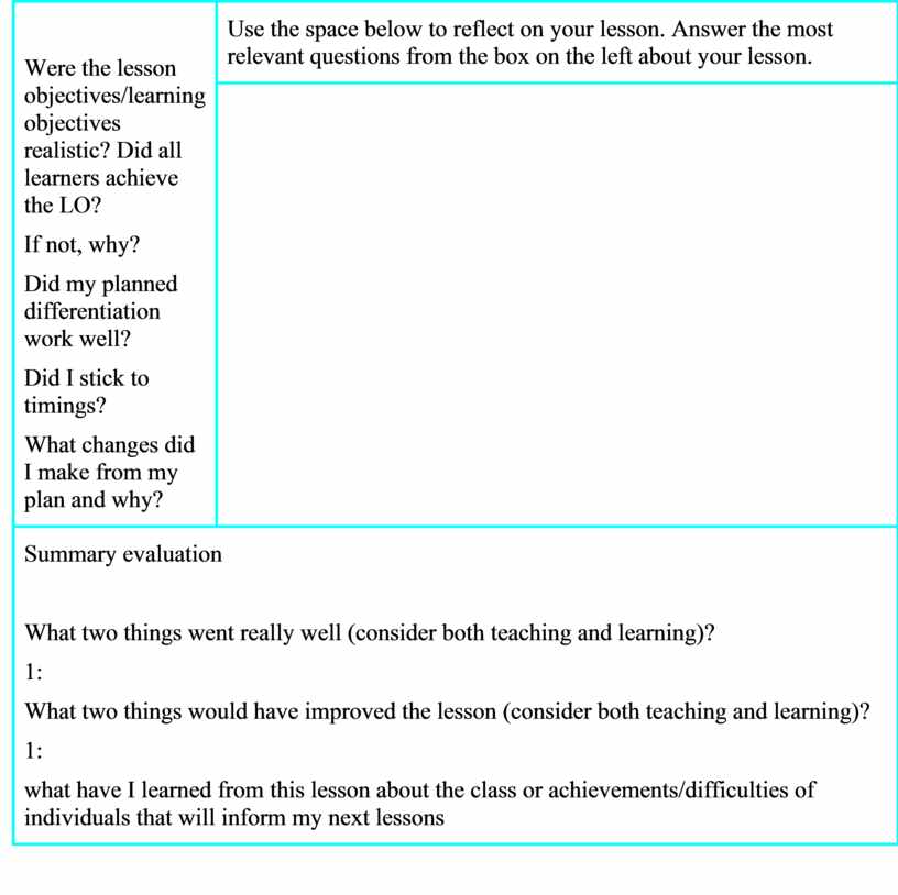 What two things went really well (consider both teaching and learning)? 1: What two things would have improved the lesson (consider both teaching and learning)? 1: what have I learned from this lesson about the class or achievements/difficulties of individuals that will inform my next lessons |
