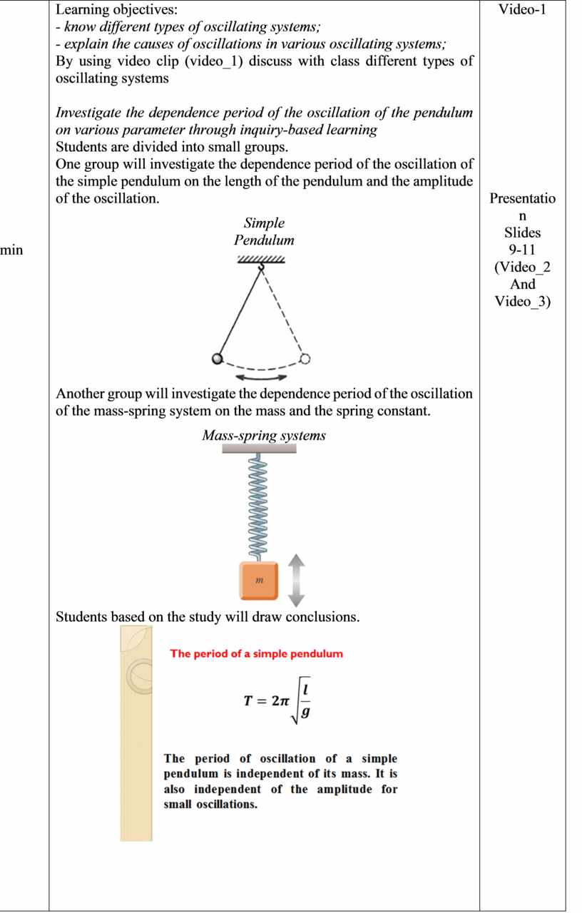 Starting point Recall and discuss with the class: - Difference between free and forced oscillations; - Characteristics of the oscillations: amplitude, time period, frequency, angular frequency, displacement, phase of oscillation. - Equations of SHM: displacement, velocity and acceleration. Determine lesson objectives with class: - know different types of oscillating systems; - explain the causes of oscillations in various oscillating systems; - investigate the dependence period of the oscillation of the pendulum on various parameters. |