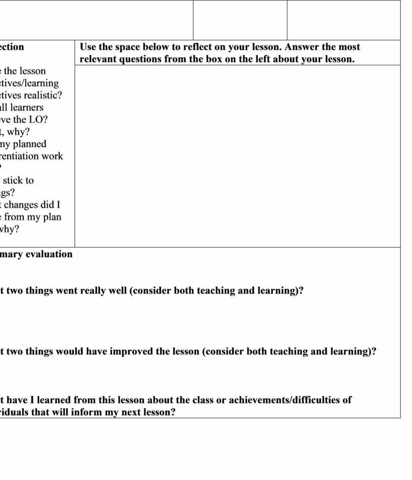 Were the lesson objectives/learning objectives realistic? Did all learners achieve the LO? If not, why? Did my planned differentiation work well? Did I stick to timings? What changes did I make from my plan and why?