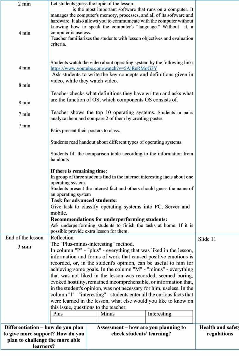 If there is remaining time: In group of three students find in the internet interesting facts about one operating system. Students present the interest fact and others should guess the name of an operating system Task for advanced students: Give task to classify operating systems into PC, Server and mobile. Recommendations for underperforming students: Ask underperforming students to finish the tasks at home. If it is possible provide extra lesson for them. |