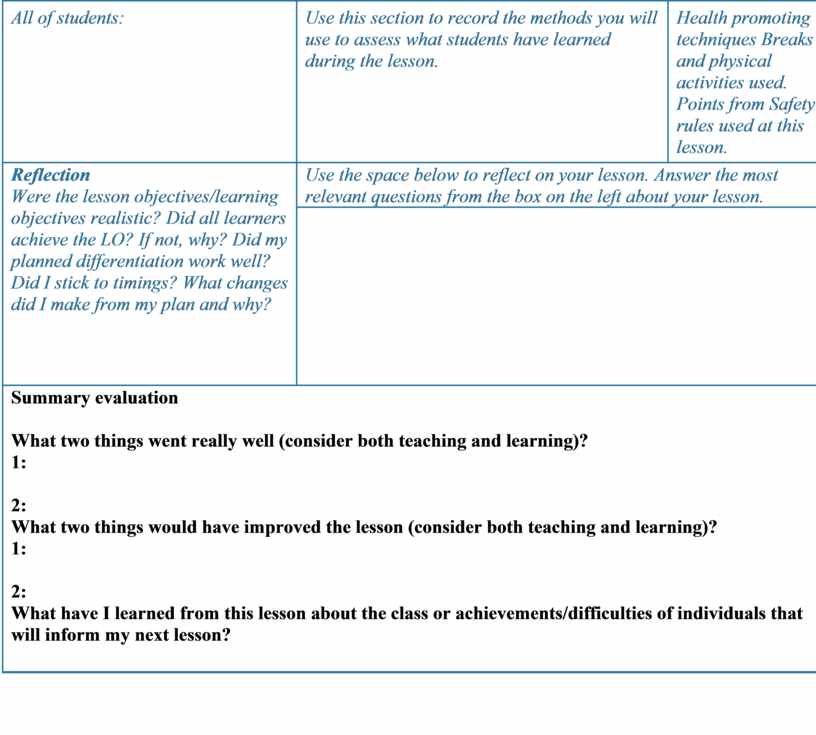 Reflection Were the lesson objectives/learning objectives realistic? Did all learners achieve the LO? If not, why? Did my planned differentiation work well? Did I stick to timings? What changes did I make from my plan and why? |