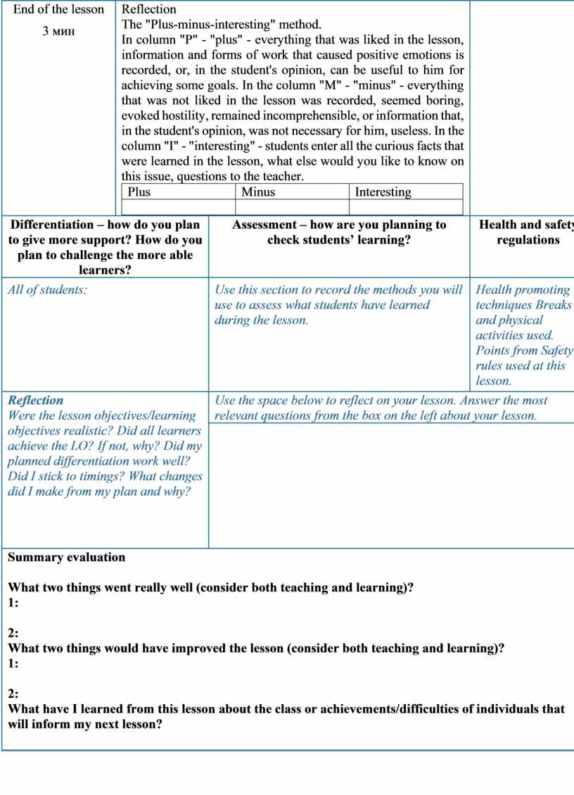 Reflection The "Plus-minus-interesting" method. In column "P" - "plus" - everything that was liked in the lesson, information and forms of work that caused positive emotions is recorded, or, in the student's opinion, can be useful to him for achieving some goals. In the column "M" - "minus" - everything that was not liked in the lesson was recorded, seemed boring, evoked hostility, remained incomprehensible, or information that, in the student's opinion, was not necessary for him, useless. In the column "I" - "interesting" - students enter all the curious facts that were learned in the lesson, what else would you like to know on this issue, questions to the teacher.