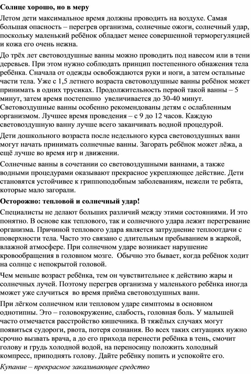 Летом дети максимальное время должны проводить на воздухе. Самая большая опасность – перегрев организма, солнечные ожоги, солнечный удар, поскольку маленький ребёнок обладает менее совершенной терморегуляцией и кожа его очень нежна.
