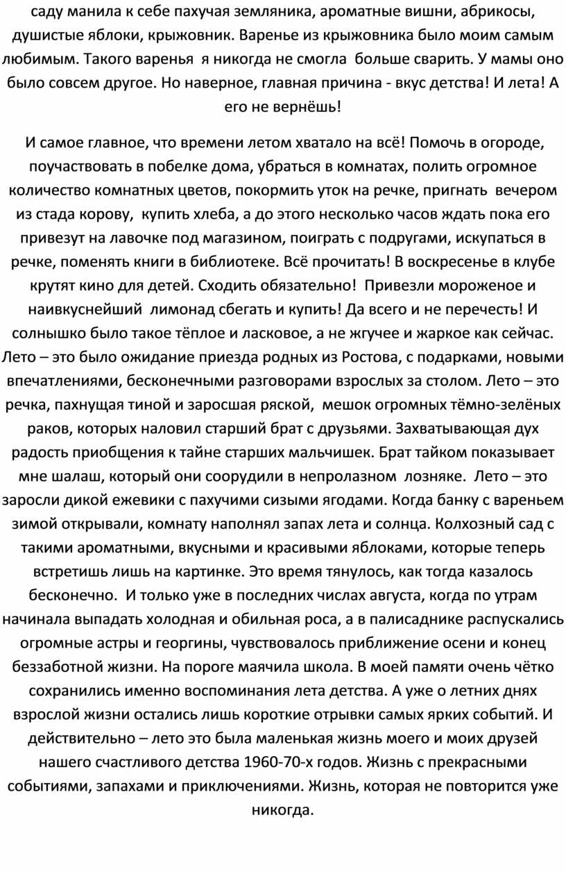 Для меня воспоминания о летней поре детства – самые яркие и незабываемые. Это « маленькая жизнь» моей уже достаточно прожитой жизни. Лето – это яркие лучи утреннего солнца, пробивающиеся сквозь закрытые старые деревянные ставни. А если они открыты, то из окон видна поросшая осокой и камышом речка «Мельничная» и плотно утрамбованная детскими ножками тропинка к ней. Мамин голос и её руки пахнущие свежей зеленью с огорода, она уже успела приготовить ароматный и наваристый борщ. Я нежусь на огромной перине, от земляного пола в доме прохладно, пахнет чабрецом, полынью и мятой. Наскоро перекусив и захватив с собой недочитанную книгу, я бегу в сад. Там под кустами старой смородины у меня есть укромное местечко, где я могу окунуться в мир своих самых верных друзей, книжных героев. В моём детском воображении я была рядом с ними, страдала, веселилась, совершала подвиги, путешествовала. Они были не только друзьями, но и мудрыми советчиками и учителями. У них я училась доброте, милосердию, справедливости, любви к окружающему миру. А в саду манила к себе пахучая земляника, ароматные вишни, абрикосы, душистые яблоки, крыжовник. Варенье из крыжовника было моим самым любимым. Такого варенья я никогда не смогла больше сварить. У мамы оно было совсем другое. Но наверное, главная причина - вкус детства! И лета! А его не вернёшь!