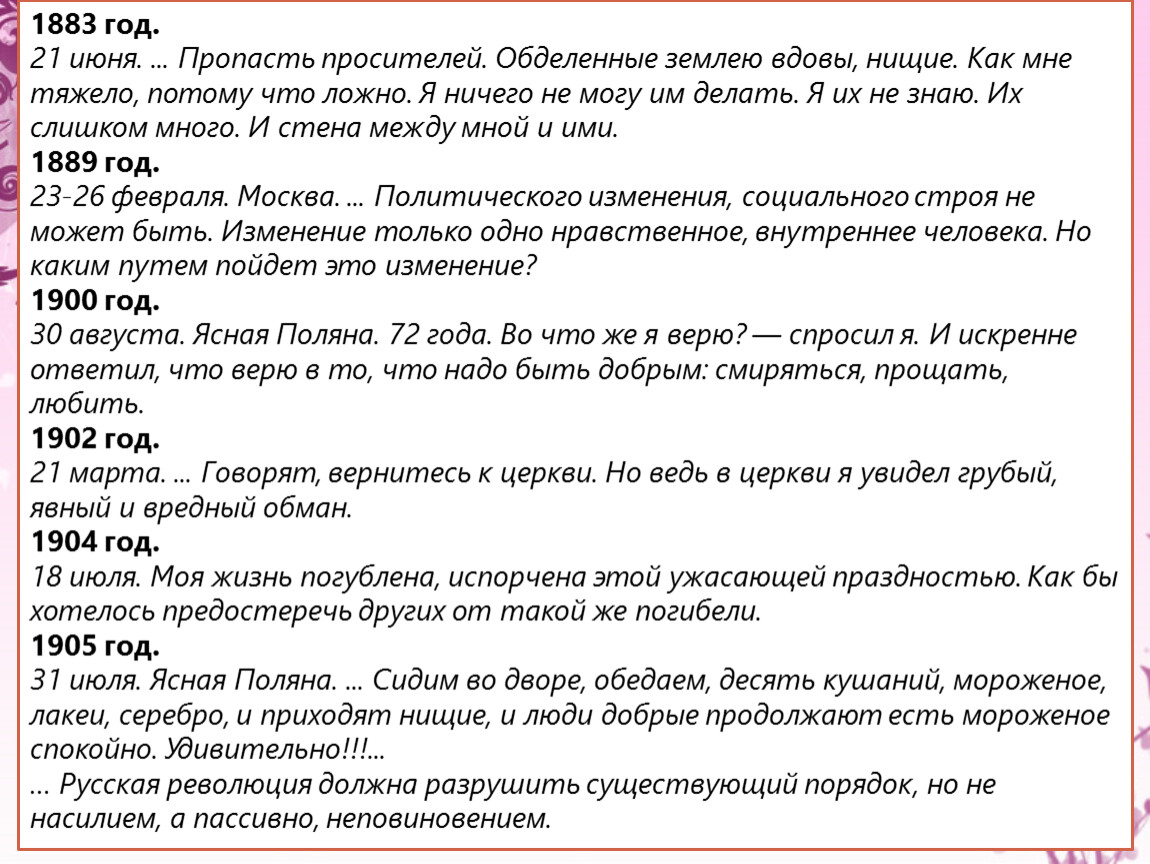 26 октября. Ясная Поляна. ... Непротивление злу насилием — не предписание, а открытый, сознанный закон жизни для каждого отдельного человека и для всего человечества…