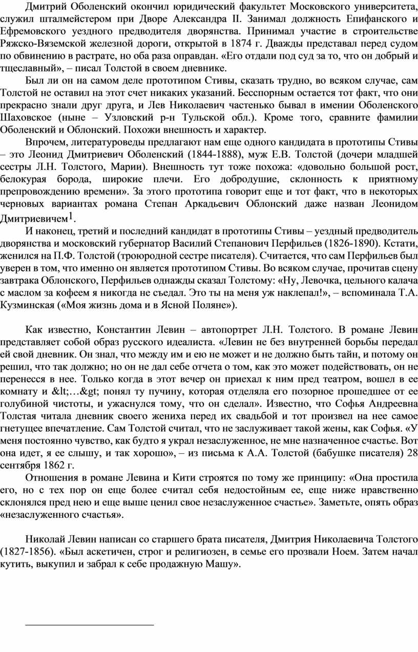 Впрочем, литературоведы предлагают нам еще одного кандидата в прототипы Стивы – это Леонид Дмитриевич Оболенский (1844-1888), муж Е.В. Толстой (дочери младшей сестры Л.Н. Толстого, Марии). Внешность тут тоже похожа: «довольно большой рост, белокурая борода, широкие плечи. Его добродушие, склонность к приятному препровождению времени». За этого прототипа говорит еще и тот факт, что в некоторых черновых вариантах романа Степан Аркадьевич Облонский даже назван Леонидом Дмитриевичем[4].