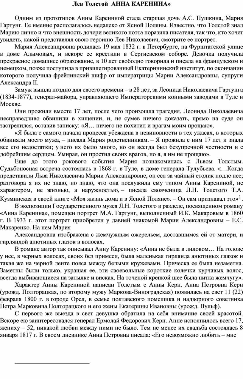 Одним из прототипов Анны Карениной стала старшая дочь А.С. Пушкина, Мария Гартунг. Ее имение располагалось недалеко от Ясной Поляны. Известно, что Толстой знал Марию лично и что внешность дочери великого поэта поразила писателя, так что, кто хочет увидеть, какой представлял свою героиню Лев Николаевич, смотрите ее портрет.