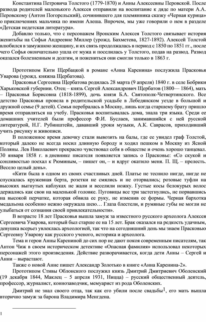 Добавлю только, что с персонажем Вронским Алексея Толстого связывает история женитьбы на Софьи Андреевне Миллер (урожд. Бахметева, 1827-1892). Алексей Толстой влюбился в замужнюю женщину, и их связь продолжалась в период с 1850 по 1851 гг., после чего Софья окончательно ушла от мужа и поселилась у Толстого, подав на развод. Развод оказался болезненным и долгим, и пожениться они смогли только в 1863 г.