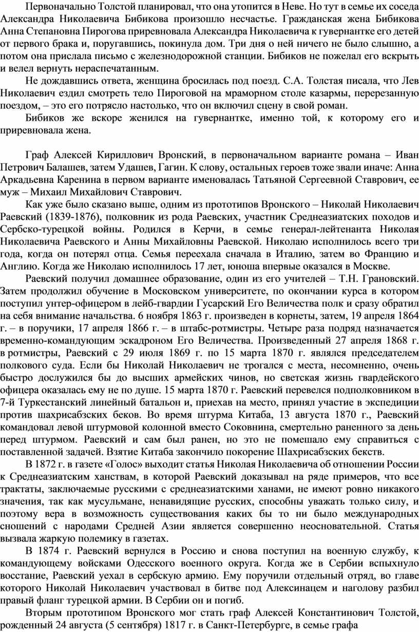 Как уже было сказано выше, одним из прототипов Вронского – Николай Николаевич Раевский (1839-1876), полковник из рода Раевских, участник Среднеазиатских походов и Сербско-турецкой войны. Родился в Керчи, в семье генерал-лейтенанта Николая Николаевича Раевского и Анны Михайловны Раевской. Николаю исполнилось всего три года, когда он потерял отца. Семья переехала сначала в Италию, затем во Францию и Англию. Когда же Николаю исполнилось 17 лет, юноша впервые оказался в Москве.