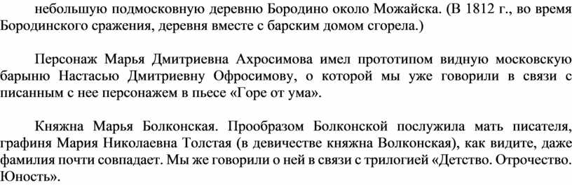 Персонаж Марья Дмитриевна Ахросимова имел прототипом видную московскую барыню Настасью Дмитриевну Офросимову, о которой мы уже говорили в связи с писанным с нее персонажем в пьесе «Горе от ума».