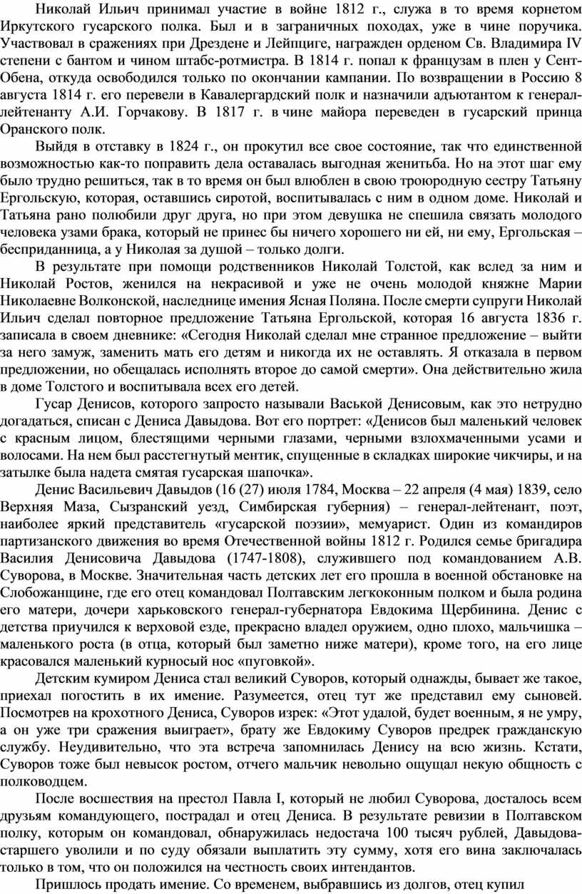 Гусар Денисов, которого запросто называли Васькой Денисовым, как это нетрудно догадаться, списан с Дениса Давыдова. Вот его портрет: «Денисов был маленький человек с красным лицом, блестящими черными глазами, черными взлохмаченными усами и волосами. На нем был расстегнутый ментик, спущенные в складках широкие чикчиры, и на затылке была надета смятая гусарская шапочка».
