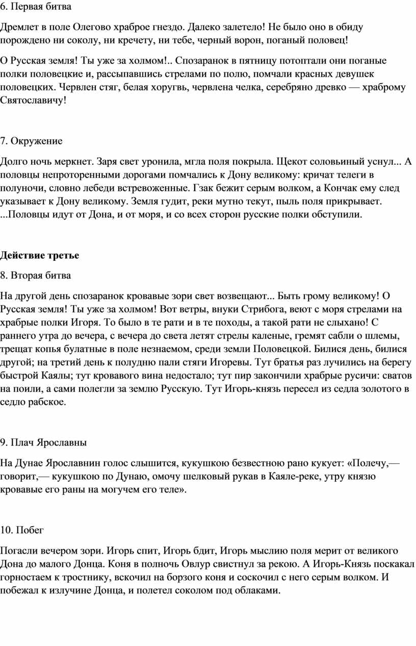 Долго ночь меркнет. Заря свет уронила, мгла поля покрыла. Щекот соловьиный уснул... А половцы непроторенными дорогами помчались к Дону великому: кричат телеги в полуночи, словно лебеди встревоженные. Гзак бежит серым волком, а Кончак ему след указывает к Дону великому. Земля гудит, реки мутно текут, пыль поля прикрывает. ...Половцы идут от Дона, и от моря, и со всех сторон русские полки обступили.