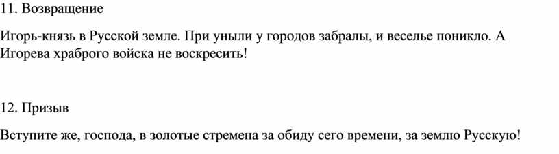 На другой день спозаранок кровавые зори свет возвещают... Быть грому великому! О Русская земля! Ты уже за холмом! Вот ветры, внуки Стрибога, веют с моря стрелами на храбрые полки Игоря. То было в те рати и в те походы, а такой рати не слыхано! С раннего утра до вечера, с вечера до света летят стрелы каленые, гремят сабли о шлемы, трещат копья булатные в поле незнаемом, среди земли Половецкой. Билися день, билися другой; на третий день к полудню пали стяги Игоревы. Тут братья раз лучились на берегу быстрой Каялы; тут кровавого вина недостало; тут пир закончили храбрые русичи: сватов на поили, а сами полегли за землю Русскую. Тут Игорь-князь пересел из седла золотого в седло рабское.